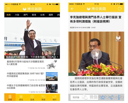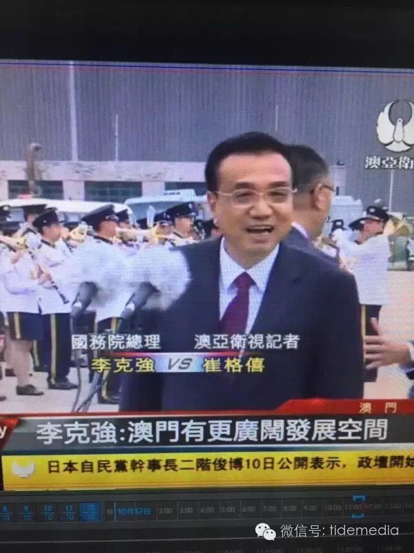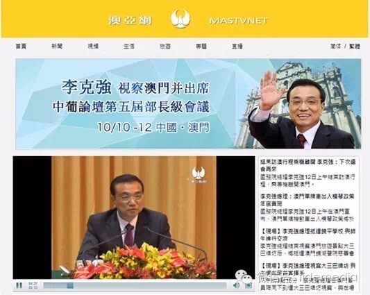 10月12日,国务院总理李克强结束访澳行程,乘专机离开澳门。本次访澳,澳亚卫视全程跟踪报道,并通过融媒体技术手段实现了互联网、移动互联网全网发布,在终端实现传统电视、PC、手机端等多终端统一发布。