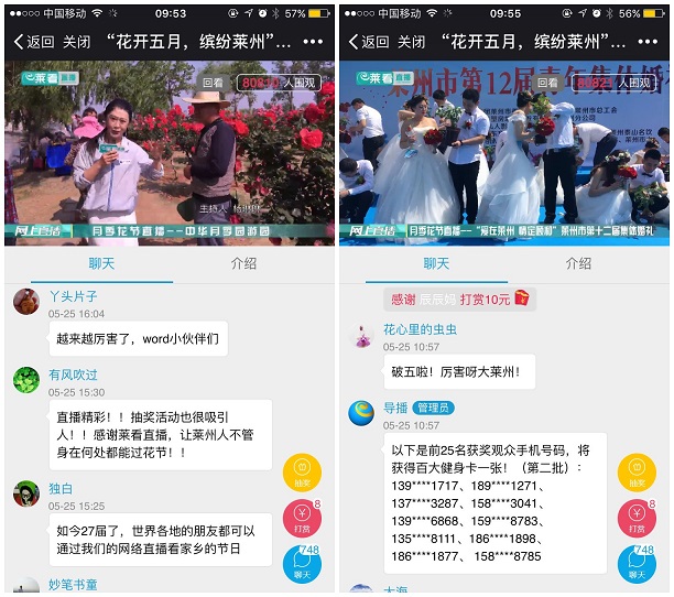 5月25日上午8:35山东省莱州广播电视台通过官方微信平台莱州新视界的《莱看直播》栏目,推出了《“花开五月,缤纷莱州”第二十七届月季花节大型直播》,连接三个现场,运用多个机位多种拍摄方式,对“中华月季园游园活动”、莱州市第十二届青年集体婚礼,以及莱州恒通汽车广场“中国汽车博览会”进行了直播。