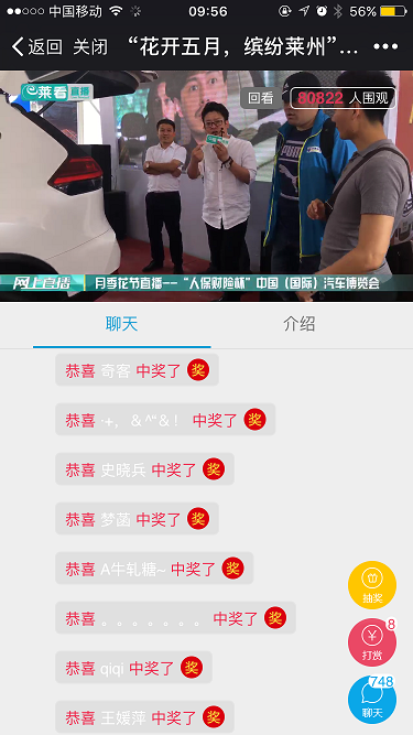 莱州市月季花节是莱州市活动内容最丰富、规模档次最高、文化内涵最深、市民参与最广、社会影响力最大的民俗文化节日。为做好今年第二十七届月季花节直播活动,基于聚现提供的多功能互动组件,在直播过程中加入抽奖环节,直播观众除了可以在线聊天互动外,只要点击抽奖按钮输入姓名和手机号就可以获得三次抽奖机会,中奖结果会实时显示在聊天界面,工作人员也会在第一时间公布中奖名单和奖品。大家通过朋友圈转发、群发等信息传播方式,短时间内打破了之前直播活动维持的高纪录,也成为莱州广播电视台尝试新型网络直播形式以来的一次重大突破。