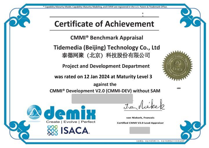 2024年1月,泰德网聚(北京)科技股份有限公司成功取得CMMI(Capability Maturity Model Integration)三级能力认证证书。此项认证彰显了泰德网聚在软件工程和项目管理领域国际化、标准化的卓越综合实,为泰德网聚业务的可持续开展提供了更加坚实的技术保证及全新动能,同时为泰德网聚未来的软件及项目管理体系建设规划提供了明确的指引。
